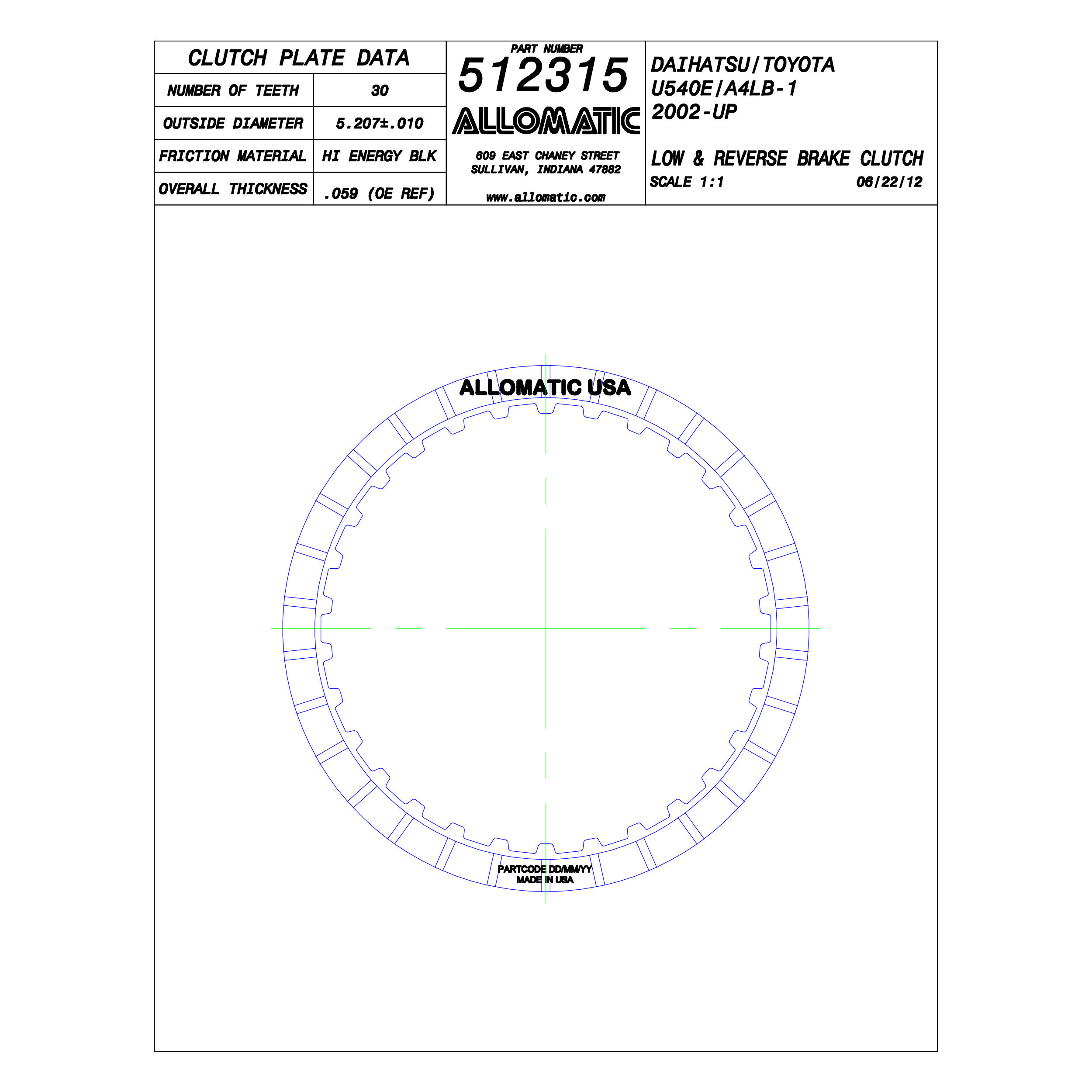 PLATO FRICCION U540E, A4LB1 BAJA, REVERSA (30D/U4/.059) 02+ ALLOMATIC